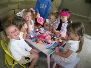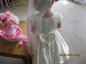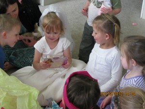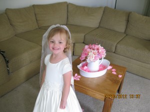 I had a ton of fun planning and decorating. Wedding's are a lot more fun when they're for a 4 year old, lot less stress (and cheaper). I also thoroughly enjoyed her excited girly giggle. Before her nap which was right before her party, she asked, "Mom are you going to wear a dress?" After I answered in the affirmative, she giggled. I could hear her giggling periodically for the next 10 minutes over the intercom. Oh, I love her!