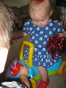 Then with Grandma Hansen and Candace she got presents. A cute dress from Grandma Siggie in Canada. Other clothes from grandmas. And a bike from mom and dad. Best $3 I ever spent at D.I.